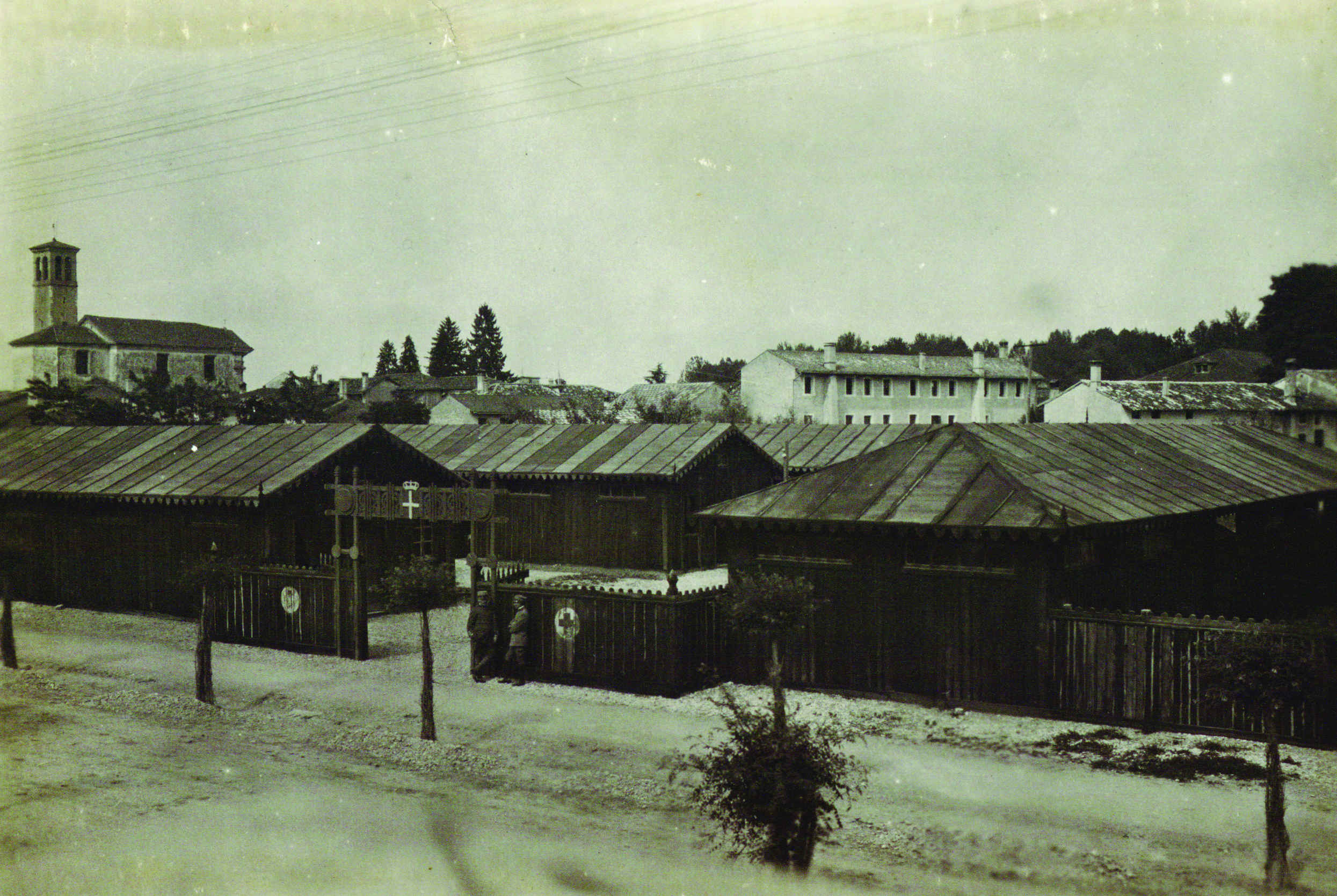 «[…] Venne costruito un vasto edificio per la mensa, mentre un piccolo villaggio di legno chiuso da una artistica cinta con i segni della “Croce Rossa” accoglie per il riposo le schiere dei futuri medici».