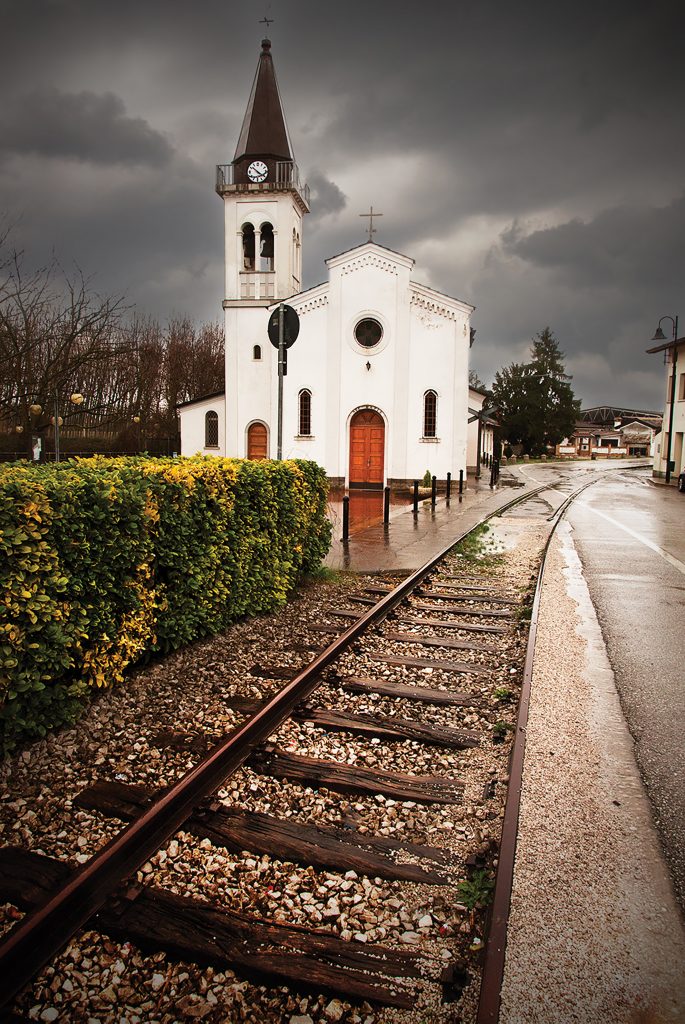 Dopo qualche centinaio di metri e oltrepassato un altro semaforo, la pista ciclabile corre a destra, protetta dalla via principale; la strada è una lingua d’asfalto di cui non si scorge la fine; la ferrovia è scivolata a sinistra, con alcuni vagoni merci a dimostrare che qui, anche se tutto appare immobile, il lavoro prosegue ininterrotto. In pochi metri, tre possibili mezzi per muoversi; destino, quello dei trasporti, presente a San Giorgio di Nogaro da tempi remoti.